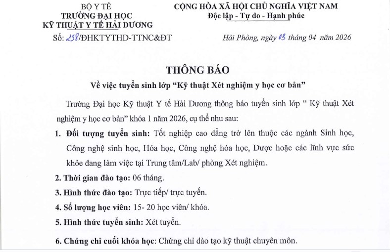 - Thông báo tuyển sinh lớp “Kỹ thuật xét nghiệm y học cơ bản” (Số 238/ĐHKTYTHD-TTNC&ĐT) 06/04/2026