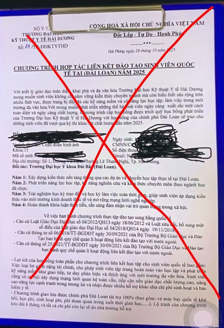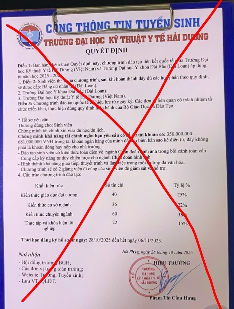 Trong thời gian gần đây, trên mạng xã hội và các kênh thông tin không chính thống xuất hiện một văn bản có tiêu đề “Chương trình hợp tác liên kết đào tạo sinh viên quốc tế tại Đài Loan năm 2025”, mang số hiệu 84/TB-ĐHKTYTHD, kèm theo dấu, chữ ký và biểu trưng giả mạo của Trường Đại học Kỹ thuật Y tế Hải Dương.
