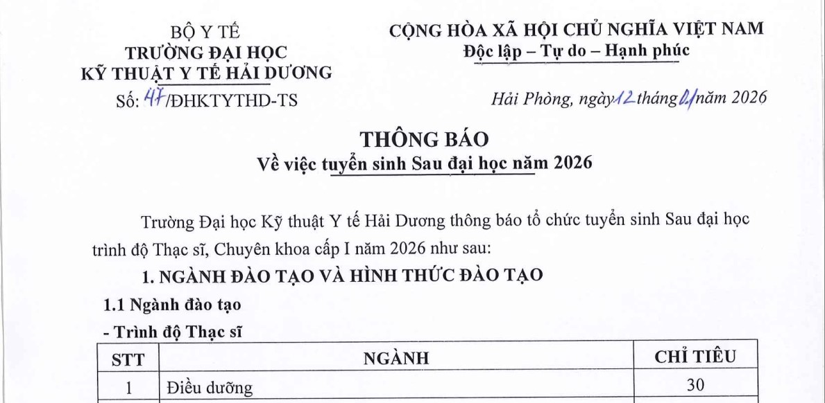 Click vào hình trên để xem chi tiết Lượt xem: 1.502 Trường Đại học Kỹ thuật Y tế Hải Dương xếp thứ 7 các trường khối ngành Y dược và thứ 70 các trường Đại học theo bảng xếp hạng VNUR-2026 Trường Đại học Kỹ thuật Y tế Hải Dương ký kết hợp tác với bệnh viện Trung ương Quân đội 108 trong hợp tác đào tạo nguồn nhân lực y tế chất lượng cao.