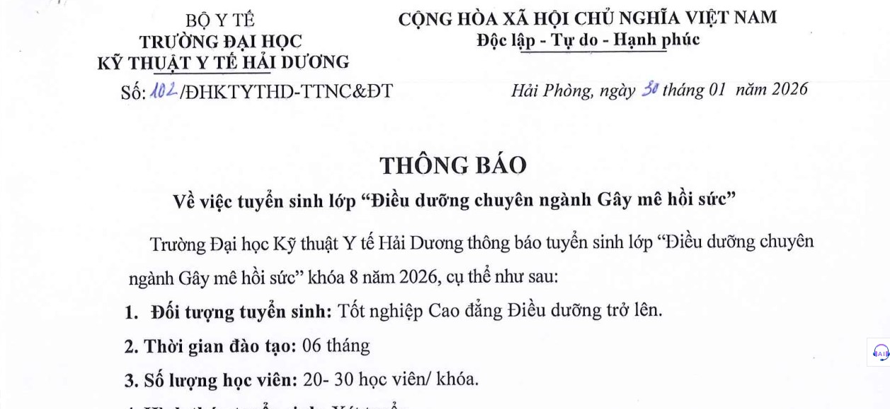 Click vào đây để xem chi tiết Lượt xem: 78 Thông báo tuyển sinh liên thông đại học chính quy, đại học Vừa làm vừa học năm 2026 (TB số 108/TB-ĐHKTYTHD) Thông báo số 103/ĐHKTYTHD-TTNC&ĐT về việc tuyển sinh lớp “Điều dưỡng chuyên ngành Nha khoa”