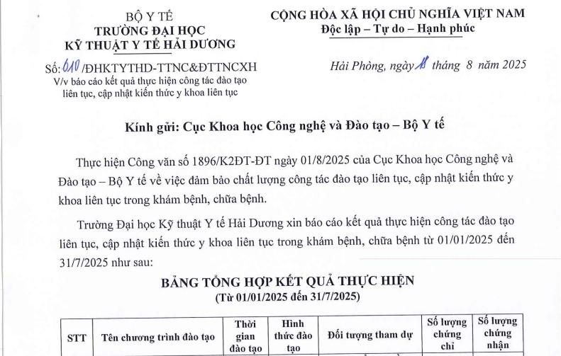 Click vào hình trên để xem chi tiết Lượt xem: 6 THÔNG BÁO VỀ VIỆC CẢNH BÁO VĂN BẢN GIẢ MẠO TÊN TRƯỜNG ĐẠI HỌC KỸ THUẬT Y TẾ HẢI DƯƠNG Hành trình công bố quốc tế trong lĩnh vực điều dưỡng