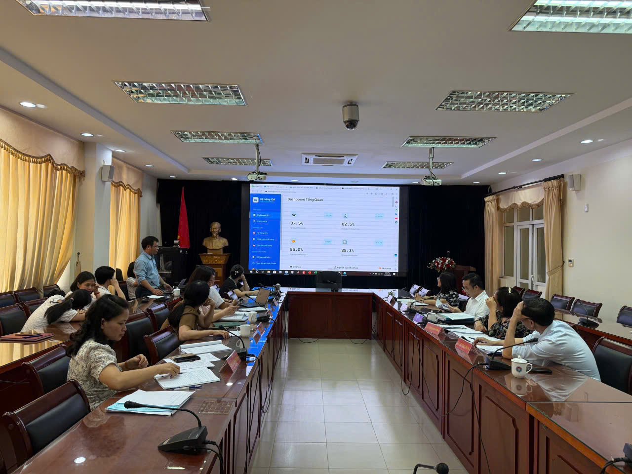 Tại buổi làm việc, đại diện nhóm nghiên cứu đã báo cáo tóm tắt quá trình triển khai dự án và các kết quả đạt được với nhiều sản phẩm cụ thể như: Bộ chỉ số KPI thí điểm cho Phòng Quản lý chất lượng và Thanh tra và Khoa Y theo nhóm công việc; phần mềm quản lý KPI tích hợp dashboard báo cáo tự động; Chatbot AI tư vấn xây dựng và đánh giá KPI; blog dự án. Những sản phẩm này bước đầu góp phần hình thành quy trình giám sát hiệu suất công việc có minh chứng và khả năng truy vết dữ liệu dựa trên công nghệ trí tuệ nhân tạo.