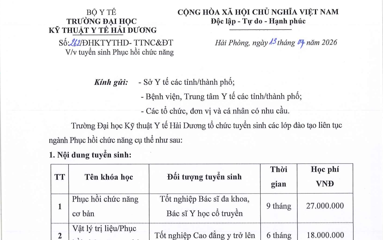 - Thông báo tuyển sinh liên tục các lớp ngành Phục hồi chức năng (Số 262/ĐHKTYTHD-TTNC&ĐT) 14/04/2026